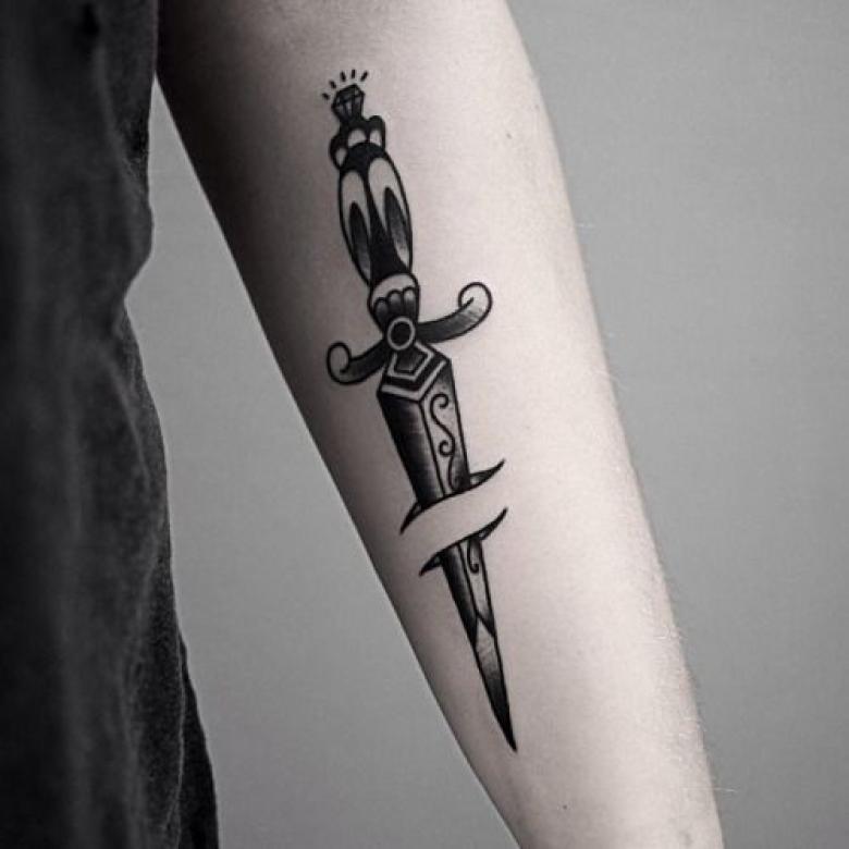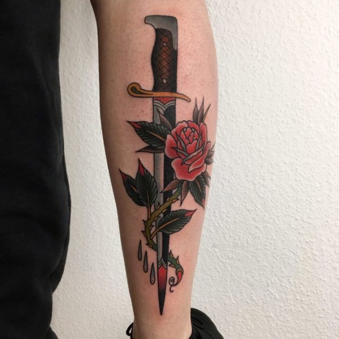 L'application de la rose en combinaison avec le poignard approfondit la signification de l'image. Une telle image symbolise des sentiments follement passionnés. Souvent, ces œuvres sont populaires auprès des jeunes en période d'amour intense. Le tatouage est placé dans la zone de l'avant-bras ou sur le bras.