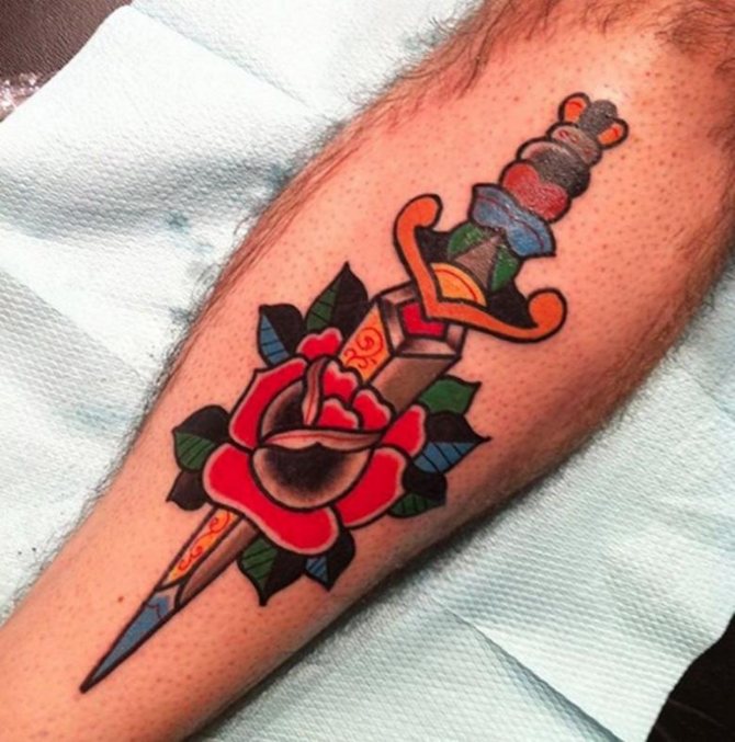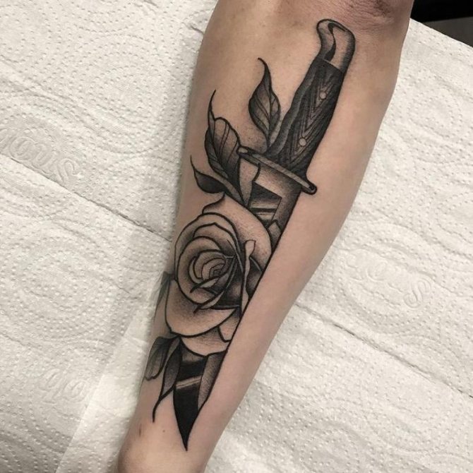 L'application de la rose en combinaison avec la dague approfondit la signification du dessin. Une telle image symbolise des sentiments passionnels fous. Il est souvent populaire auprès des jeunes pendant les périodes d'engouement intense. Le tatouage est placé dans la zone de l'avant-bras ou sur le bras.