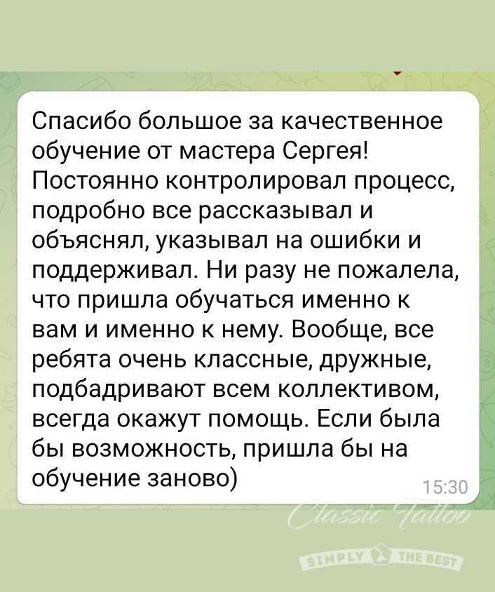 Je vous remercie d'avoir étudié au studio "Klassik" et je tiens à vous remercier pour les connaissances, les compétences et une merveilleuse atmosphère dans le studio et le personnel. Des remerciements particuliers au maître Sergei pour son encadrement, ses conseils et ses recommandations pendant la formation, il a également aidé à la sélection de l'équipement, expliqué les nuances du travail, les questions de stérilisation, l'élaboration de croquis. Merci encore beaucoup pour cette merveilleuse expérience et ces connaissances♥️.
