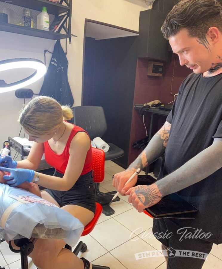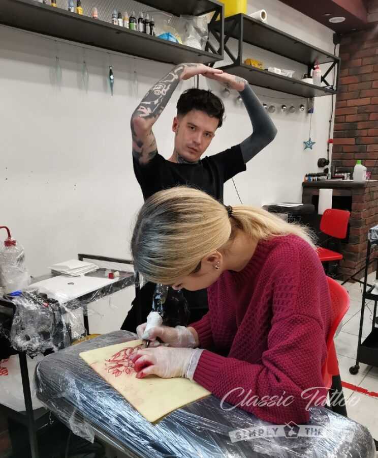 Les cours de tatouage de "Classic Tattoo", dont une grande partie est consacrée à la pratique sur des personnes réelles (modèles), prépareront le maître novice au travail réel avec toutes les nuances et les moments de travail possibles. L'étudiant apprendra à comprendre le client et à entendre ses souhaits et ses objections.