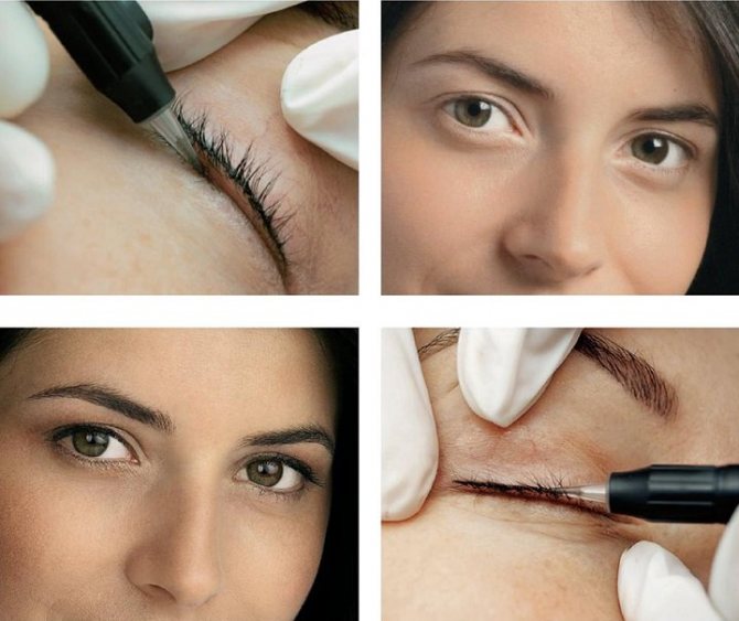 L'introduction se fait à l'aide d'une aiguille spéciale en micro-pénétrant la peau à une profondeur d'environ deux millimètres. Cette atteinte à l'intégrité de la peau conduit finalement à la formation de gonflements (bosses). Sur la photo, vous pouvez voir la différence après la procédure de tatouage de la flèche des yeux avant et après l'apparition des poches.