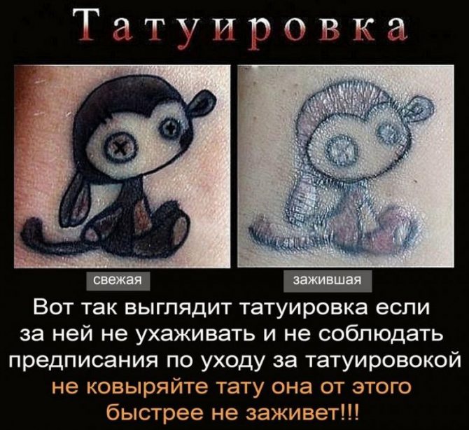 Le tatouage est une intervention qui s'accompagne d'un drainage lymphatique, d'une fièvre locale et d'un gonflement. Après l'intervention, l'artiste appliquera une pommade cicatrisante avec un antiseptique et une compresse spéciale. Pendant le processus de guérison, il faut veiller à ce qu'aucune croûte ne se forme. Si des croûtes se forment, il ne faut pas les enlever, sinon on ne pourra pas éviter les lacunes du dessin.