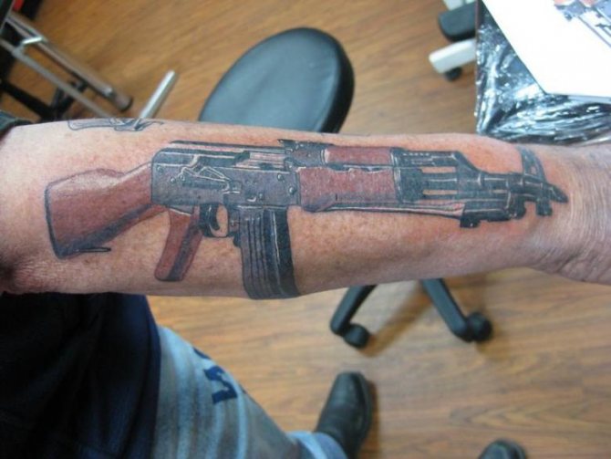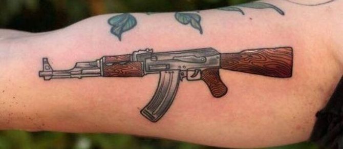 L'image montre la force et la masculinité. Les représentants de la moitié forte de l'humanité avec une mitraillette sur le corps disent qu'ils sont résolus, qu'ils peuvent réagir rapidement aux événements, sans perdre de temps en sentimentalité excessive. Les jeunes hommes ne s'efforcent pas de mener des négociations longues et vides, ils vont directement à la solution de l'essence du problème. Le pistolet permet de faire avancer les choses, d'avoir une pensée objective, de connaître les faits, de s'engager dans le style de l'armée.