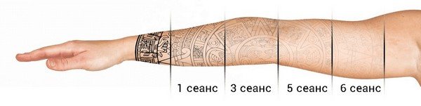 On estime qu'en une séance, le tatouage s'éclaircit de 10 à 15 %. Mais les maîtres recommandent d'attendre le résultat non pas immédiatement, mais après quelques semaines. C'est pourquoi il y a un écart considérable entre les visites chez un spécialiste pour l'élimination. Il est impossible de traiter la peau au laser tous les jours, il y aura une brûlure.