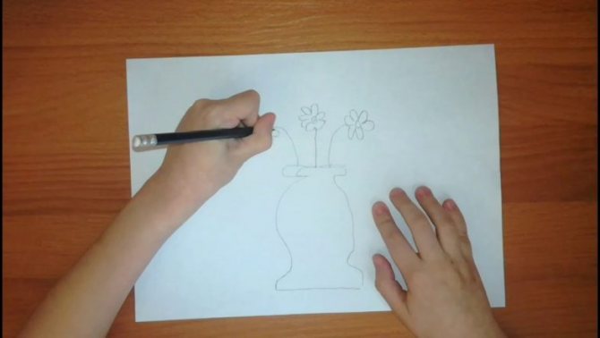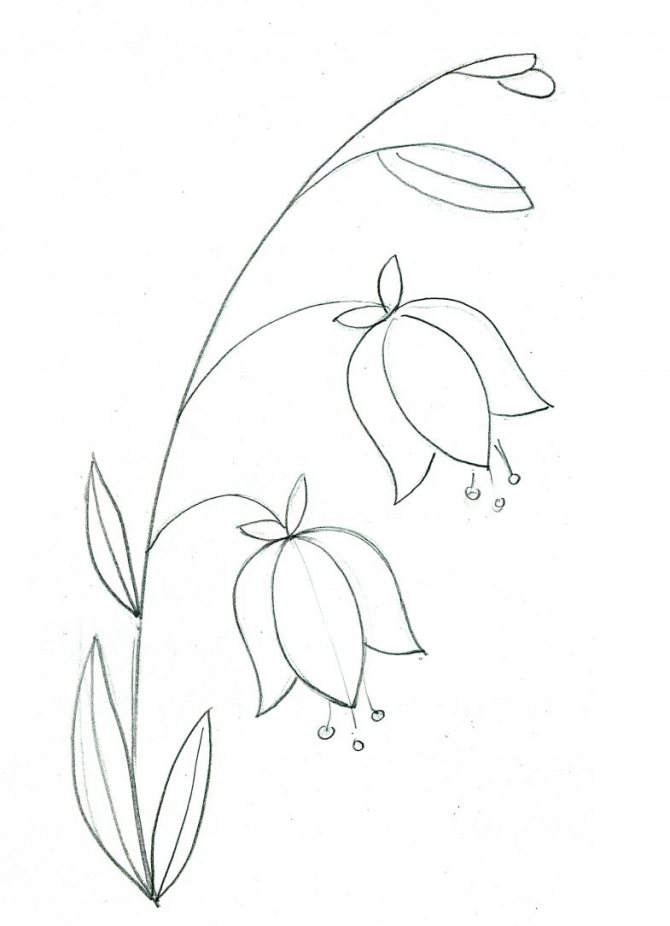- De chaque côté, en partant du bas de la silhouette, ajoutez un pétale supplémentaire. Sous la plante, nous déduisons deux feuilles, qui sont dirigées vers le bas. On les divise en deux morceaux et entre les feuilles on finit de dessiner la tige.