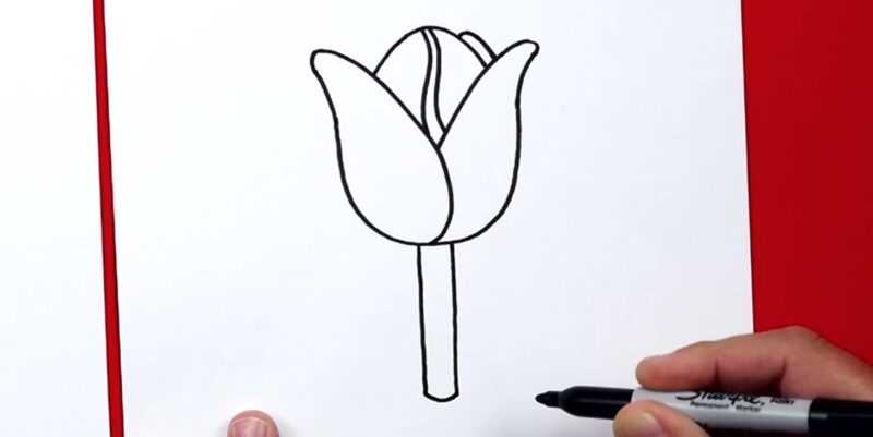 L'étape suivante consiste à dessiner la tige. C'est la partie la plus facile du dessin de la fleur. Il suffit de tracer 2 lignes parallèles, reposant à la base du bourgeon. Notez que la tige sera cachée par les pétales suspendus, vous n'avez donc pas besoin de la dessiner au-dessus des pétales.