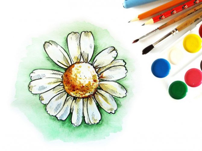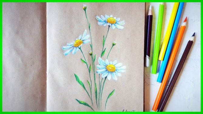 Une autre façon de dessiner une marguerite est d'utiliser un dessin de couleur. Il faudra un crayon simple, des crayons jaune, vert, vert foncé, orange et bleu.