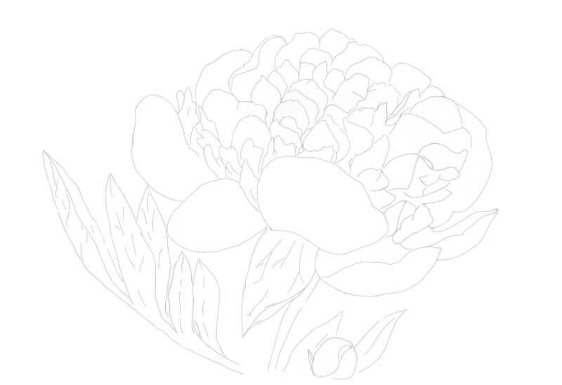 Dessinez maintenant les pétales qui se trouvent devant le bourgeon. Leurs formes sont légèrement négligées, ce qui est courant avec les fleurs :