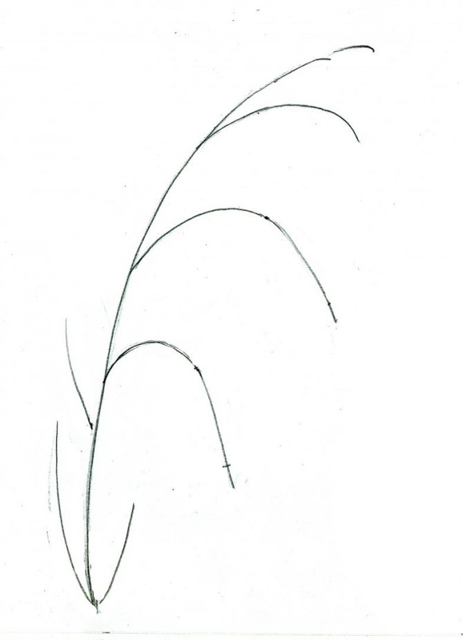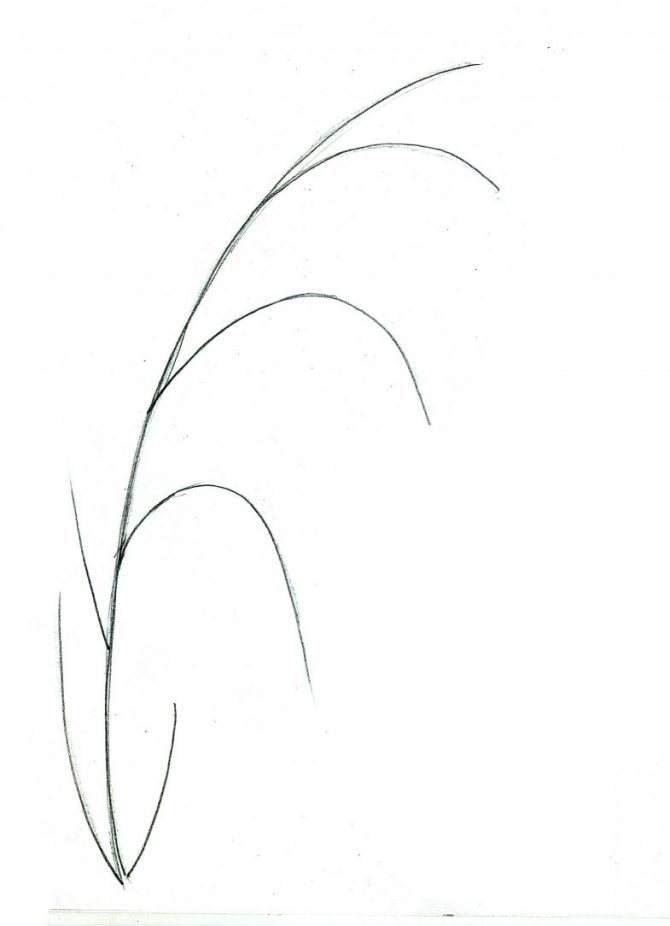 - Dessinez une tige avec des feuilles pointues. Tracez avec un crayon vert. Faites des stries vert foncé sur les feuilles.