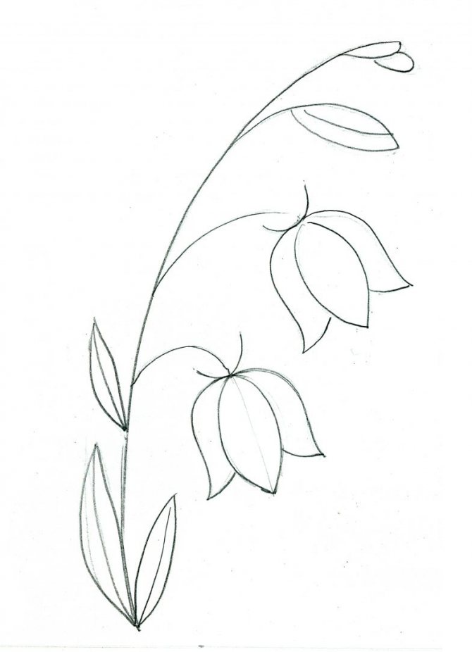 - À partir de la base de la fleur, dessinez une tige et deux feuilles étroites sur celle-ci en deux lignes parallèles.