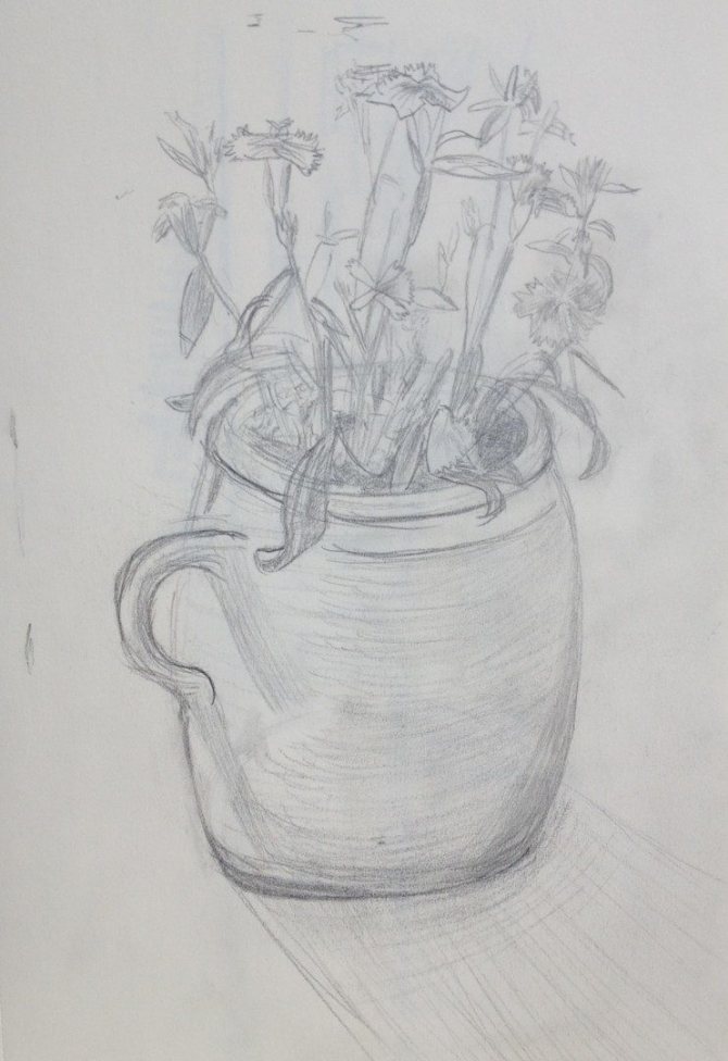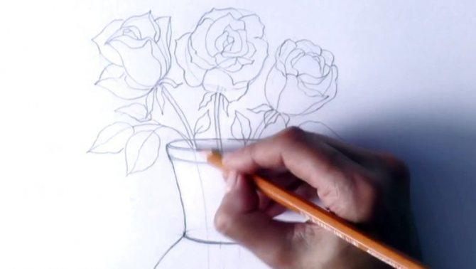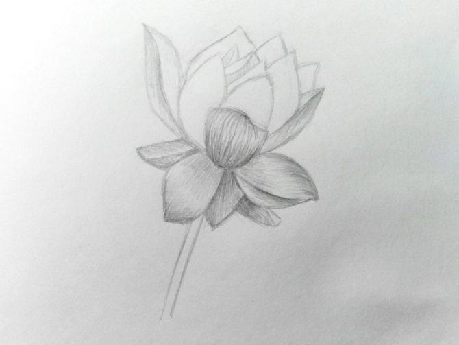 Continuez à appliquer des traits sur les pétales inférieurs avec un simple crayon, en créant une ombre. Rappelez-vous également que pour rendre la forme des feuilles plus volumineuse, vous devez dessiner des lignes sur la forme des feuilles :
