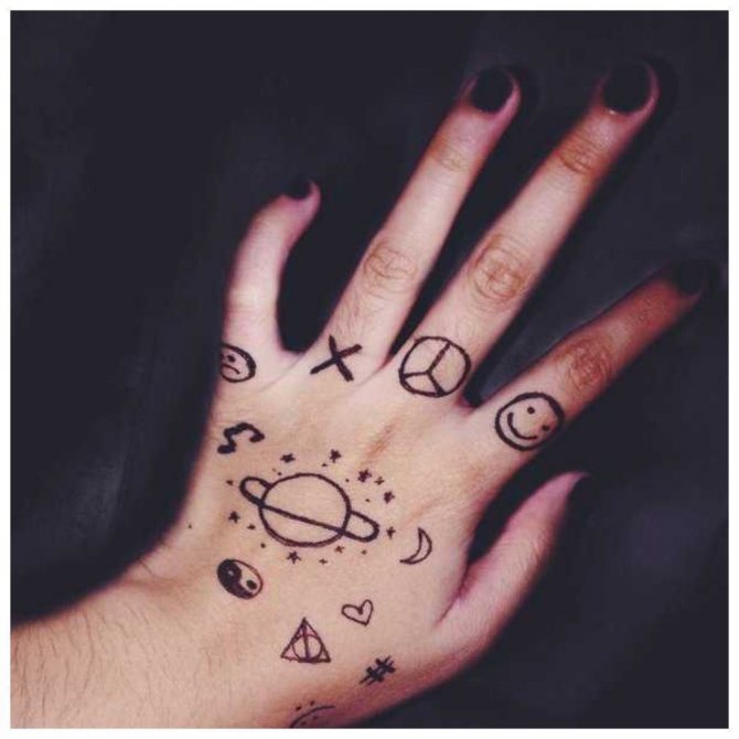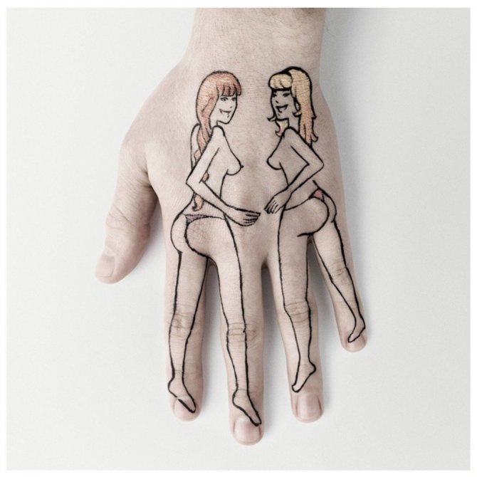 Et aux dessins les plus simples, mais non moins attrayants, on peut attribuer des images, réalisées dans le style Handpoke. Ce tatouage a parfois l'air idiot et représente souvent une image corporelle humoristique ou amusante.