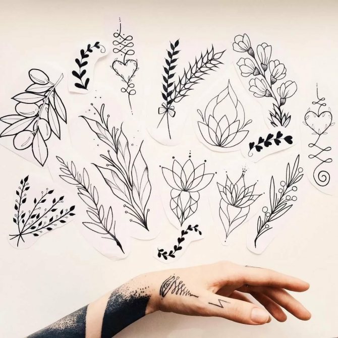 Les tatouages représentant une variété de fleurs et de végétaux sont des images polyvalentes qui sont aussi populaires auprès des filles que des garçons. Les visiteurs des salons de tatouage ont une affection particulière pour les roses ou les trèfles, mais cela ne signifie pas qu'il existe d'autres fleurs ou que vous ne devez pas vous parer d'autres images dans la même veine. Les épillets et les rameaux fleuris, les silhouettes de pissenlits ou les feuilles de fougère sont très délicats et élégants. Le choix est aussi vaste et polyvalent que le monde de la fleuristerie. Les ornements corporels peuvent être très minuscules et se composer de traits et de lignes minuscules ou, au contraire, attirer le regard et présenter des contours éclatants. Les tatouages représentant des fleurs, des brindilles, des feuilles ou des bourgeons sont harmonieux sur le pied, la cheville, toute partie de la main, le cou, la clavicule ou l'omoplate.