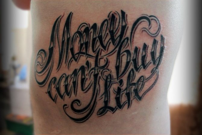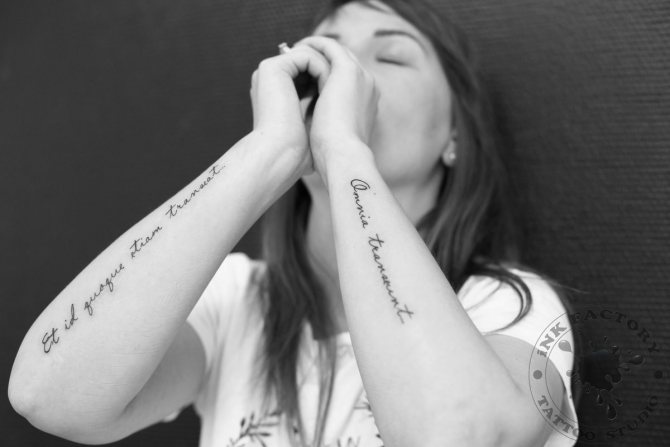 L'un des tatouages les plus populaires est considéré comme une inscription. Il est parfait pour s'exprimer et révéler l'essence même du tatouage. En représentant un motif sur le corps, nous ne pouvons qu'évoquer symboliquement l'idée ou la signification sous-jacente du tatouage. Cependant, les tatouages d'inscription nous permettent de parler directement de leur signification et d'exprimer nos pensées et nos attitudes. La police et le style jouent un rôle important dans un tel tatouage. Ceux-ci créent le contexte et l'ambiance de l'interprétation de l'inscription choisie sur le corps. Il est populaire de mettre des phrases lyriques en écriture calligraphique à la main. Mais des expressions fortes et fortes - dans le style traditionnel ou gothique.