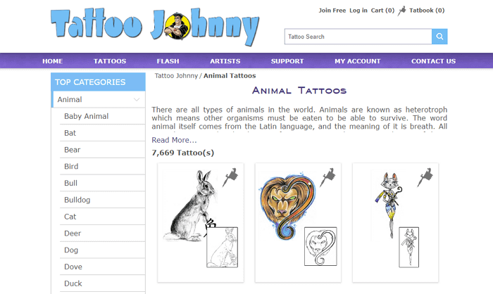 Tattoo Johnny dispose d'une énorme base de données de tatouages qui compte plus de 100 000 motifs. Ils sont tous regroupés en catégories : animaux, astronomie, mythologie, religion et bien d'autres encore.