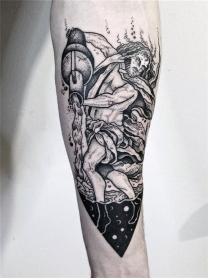 Le tatouage de la constellation du Verseau réalisé est une version intéressante, inhabituelle et plutôt compliquée du dessin, qui a la préférence des filles. La sophistication et le caractère unique du motif peuvent être accentués par de petits éléments supplémentaires - un éparpillement d'étoiles, un ciel galactique.