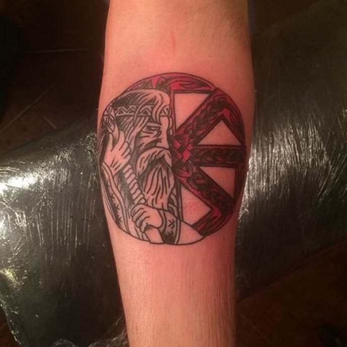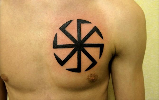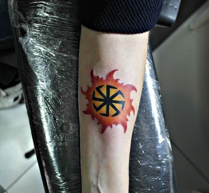 Le soleil symbolise la montée des forces de la lumière, les énergies du soleil et de l'ouest. Dans le tatouage, Kolovrat a réuni la signification originale et les nouvelles interprétations. Symbole slave dénotant la valeur, la lignée princière, l'opposition aux ténèbres et à la peur.