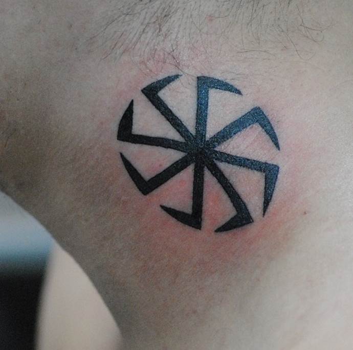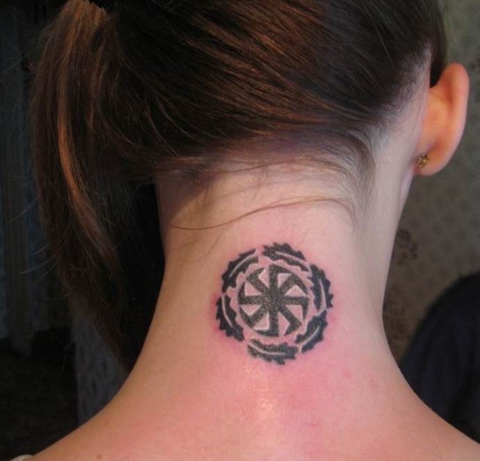 Les filles tatouent la rotonde sur leur cou, souvent sous leurs cheveux. La cape d'une femme attire les énergies qui aident à construire une famille, ainsi qu'à donner ce qui permet de la garder et de la protéger. Pour les hommes, le kolovrat autour du cou renforce le lien avec les forces supérieures. Pour les hommes, le soleil autour du cou illumine le chemin, mettant en évidence les événements et les choses vraiment importantes pour eux.