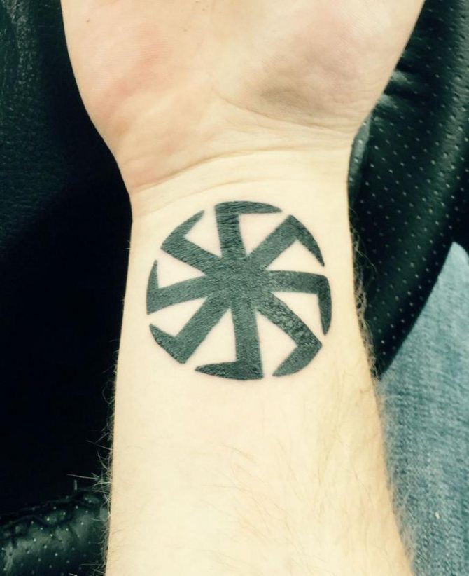 Le tatouage est représenté dans un cercle et ressemble à une petite roue. Si vous regardez attentivement ce panneau, vous pouvez même voir les rayons. Si l'on en croit les experts, ce signe indique l'infinité de la vie et le mouvement continu du soleil. Les interprétations les plus courantes sont :