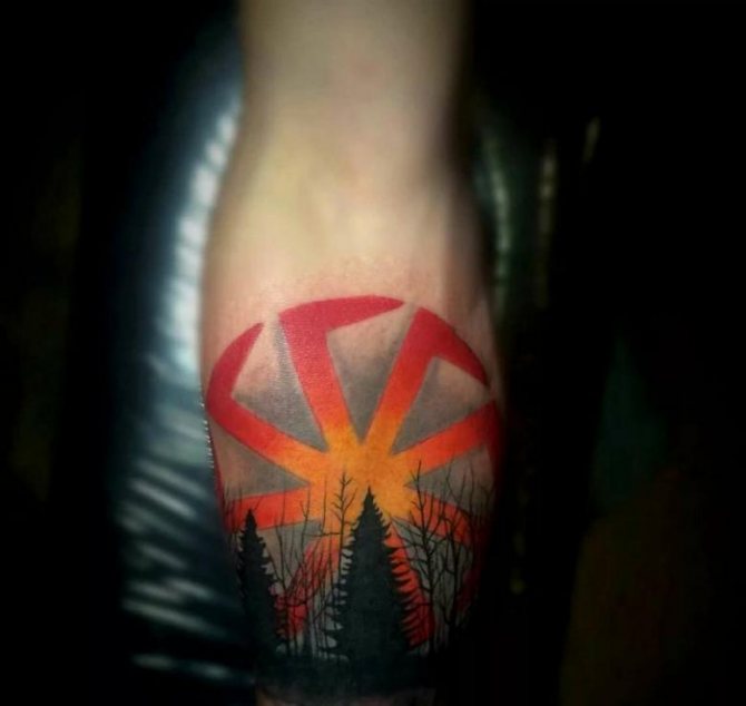 Le Kolovrat est l'incarnation du feu divin céleste. Le signe a pleinement adopté cette interprétation. Le tournesol tatoué est une personnification du soleil, de la chaleur, de la naissance et de l'esprit.