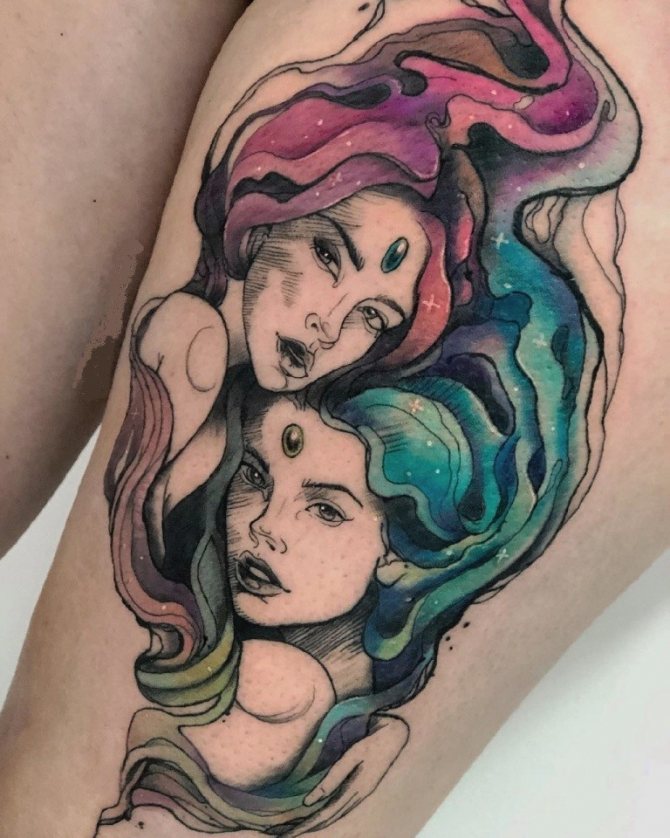 La version classique de tout tatouage est noire. De tels tatouages ont un aspect familier et non moins frappant. Pour les filles, vous pouvez ajouter des teintes chaudes et vives au croquis, comme le violet, le rouge, le rose, le vert. Les tatouages de Gémeaux pour hommes sont le plus souvent noirs, mais les maîtres les complètent avec des teintes neutres comme le bleu ou le gris.