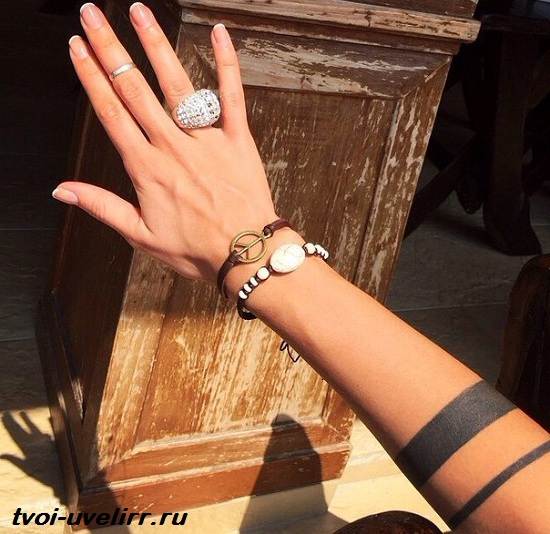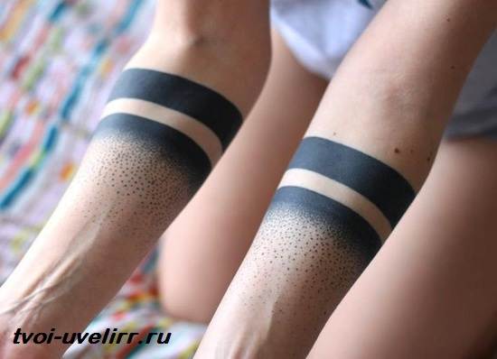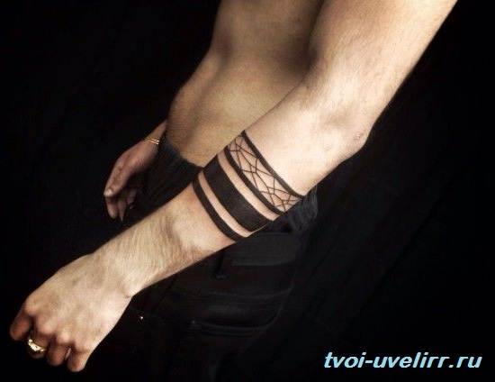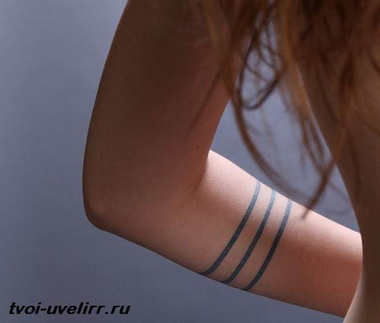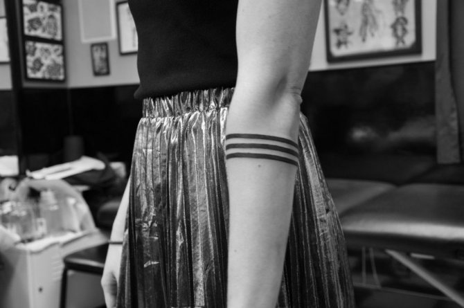Le tatouage de deux bandes sur le bras est considéré comme polyvalent en termes de combinaison et peut être associé à différentes variations d'autres signes et symboles. Il s'agit d'une sorte de décoration corporelle, d'un bijou en forme de bracelet qui possède sa propre énergie et sa propre signification.