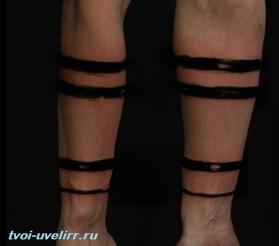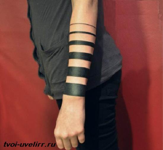 Les bandes de tatouage sur le bras, qui pointent verticalement vers le haut du corps, évoquent le développement personnel et un mouvement constant vers l'avant. Une personne se cherche et cherche son entreprise, cherchant à apprendre de nouvelles choses et découvrant des horizons intéressants. La ligne peut être perçue comme une route, qui sera porteuse d'événements positifs et seulement bons.