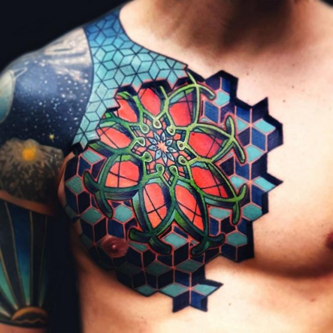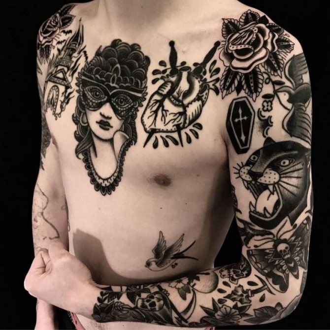 Sur la poitrine apparaîtront harmonieusement différentes variantes de tatouages, qu'il s'agisse d'objets, de symboles, d'animaux ou d'oiseaux. Leur objectif principal est de protéger contre les dangers et les risques pour la vie.