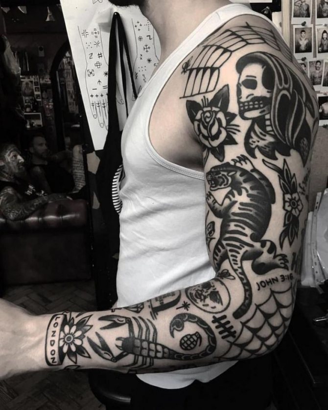 La manche est une composition complexe qui ne peut suggérer la présence d'un petit tatouage. Il peut s'agir d'images en noir et blanc ou en couleurs de différents personnages et objets.
