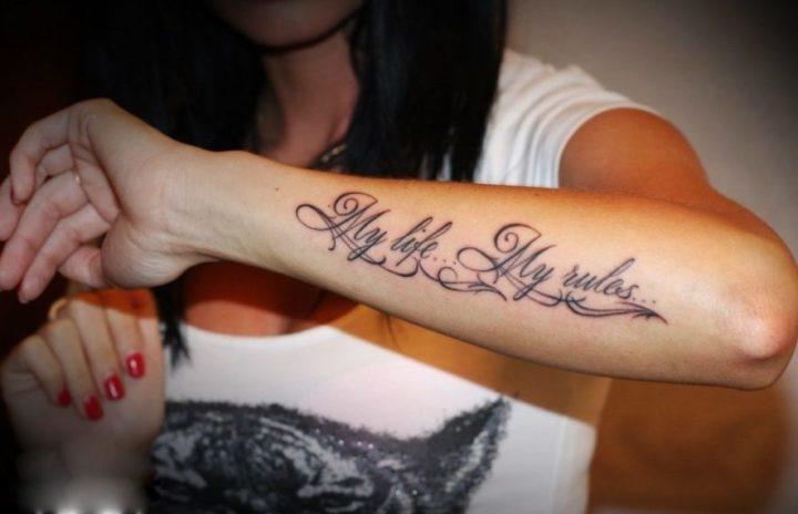 Les tatouages féminins sont disponibles en caractères gothiques, manuscrits ou tridimensionnels. Il peut s'agir de hiéroglyphes, de caractères arabes ou de textes dans l'une des langues européennes. Par fréquence d'utilisation, les inscriptions sont les plus populaires et par lieu, elles sont universelles.