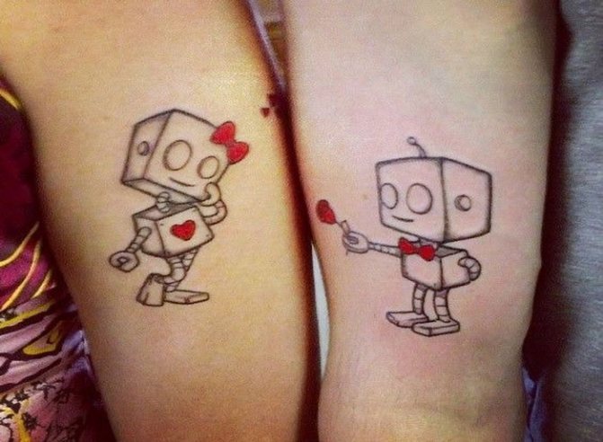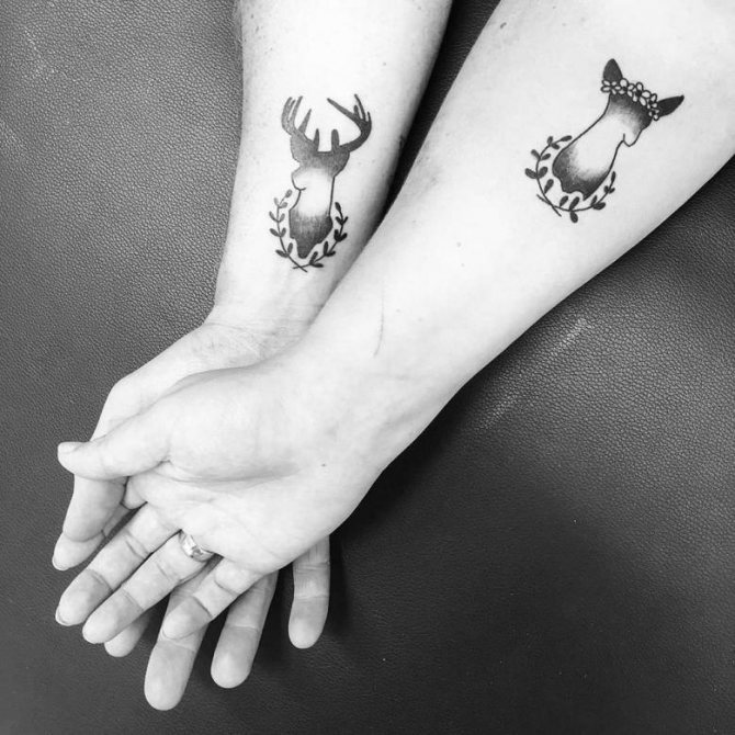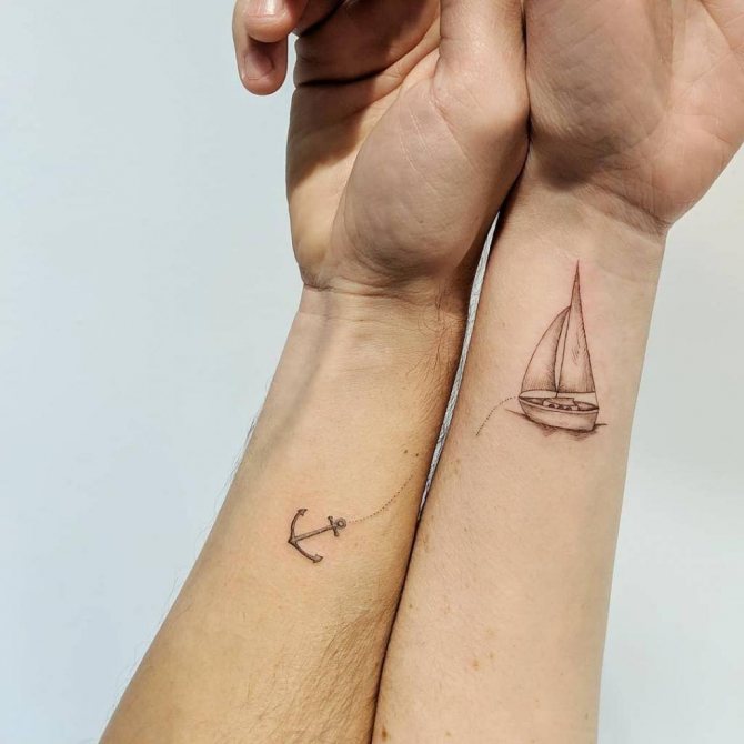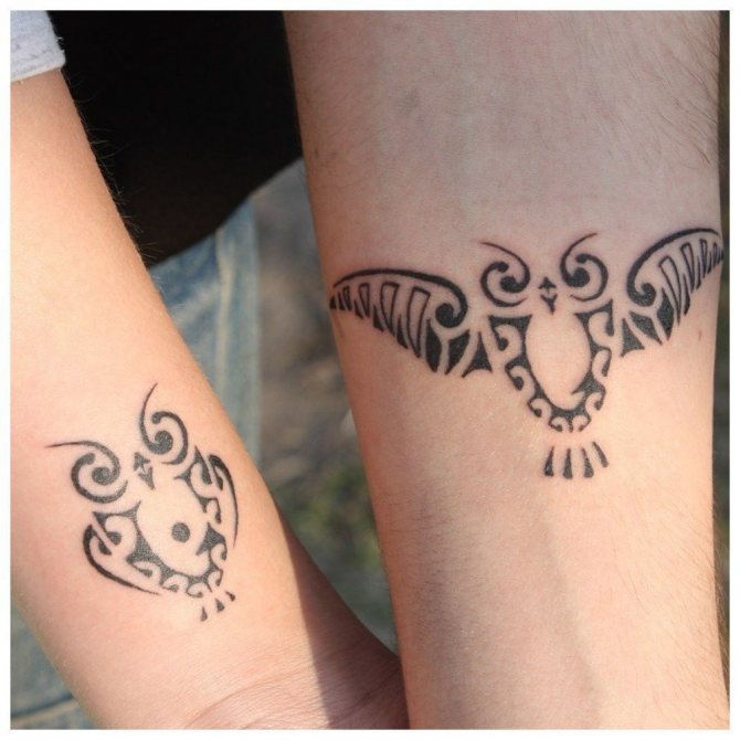 Il existe un certain nombre de tatouages dont les images sont intrinsèquement significatives. Son symbolisme se manifeste généralement par la combinaison des tatouages les uns avec les autres. En regardant de tels dessins, on a l'impression que leur format a été délibérément divisé et qu'ils ont été délibérément conçus pour des personnes différentes. Des compositions à part entière sur le corps sont obtenues en combinant les dessins, mais une à une, ces images semblent un peu bancales. La plupart des sentiments sont exprimés à travers une image corporelle. Lorsque l'on choisit une photo de couple, il faut y mettre une signification profonde, qui sera d'importance égale pour les deux. Il ne faut pas être irresponsable dans le choix d'un tatouage de couple.