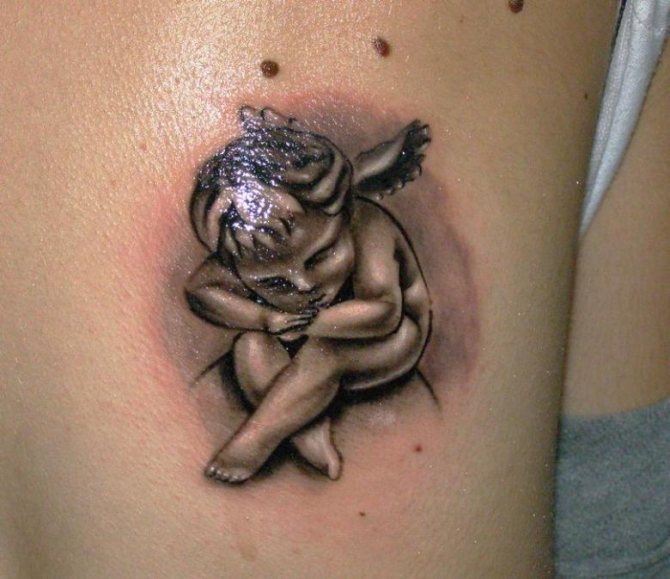 Un tatouage combine des significations comme la foi, l'amour, la spiritualité. Le dessin protège le porteur contre la trahison de ses proches. L'image d'un ange augmente le bonheur dans la vie d'une personne.