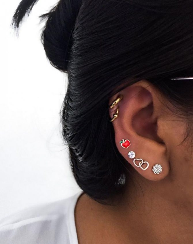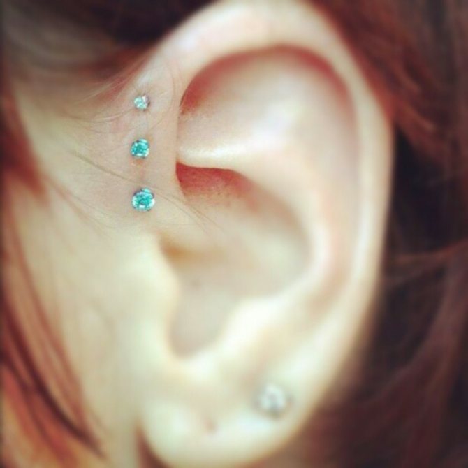 - Perçage de l'hélice - Le piercing est réalisé dans la partie supérieure de la courbe du lobe de l'oreille. Elle est réalisée à l'aide d'une petite aiguille creuse. La plupart du temps, de petits anneaux ou des clous sont insérés dans les trous. Le temps de guérison dure de quelques semaines à quelques mois.