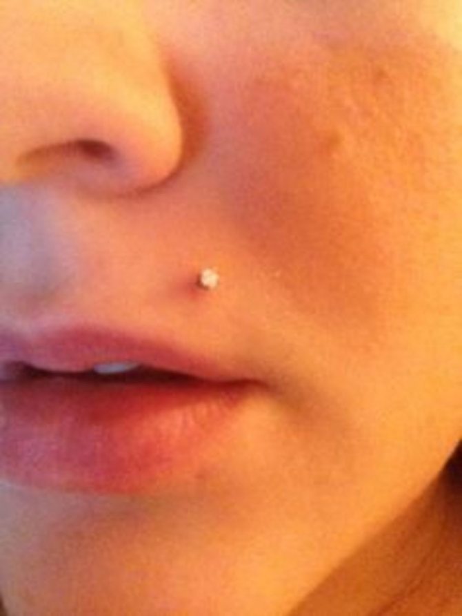 - Monroe - Un piercing sous la forme d'un petit grain de beauté rond sur le côté gauche de sa lèvre supérieure.