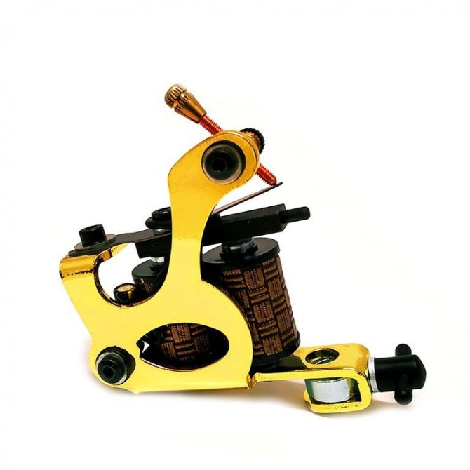 Un appareil de contournement simple et léger. La machine absorbe le pigment dans la peau le plus rapidement possible, ce qui contribue à la guérison rapide du dessin sans perte de "couleur". Le cadre est en acier au carbone et peint en or. Les bobines sont au nombre de 10. Conçu pour fonctionner avec des appareils de 1,5 à 2 ampères.