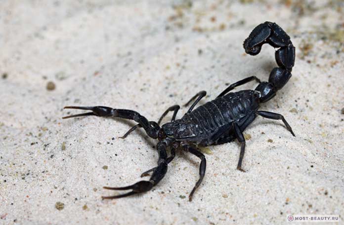En outre, le scorpion arabe à queue épaisse est d'une couleur noire effrayante, et a un comportement agressif, donc, étant dans les zones de son habitat, vous devez être extrêmement prudent.