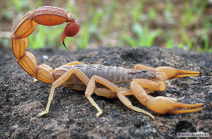 Scorpion - Une créature prédatrice ressemblant à une araignée. Il a huit pattes. Une paire de membres se termine par des griffes. La partie segmentée de la queue avec une pointe incurvée à l'extrémité lui donne une apparence reconnaissable. Les 1750 espèces connues sont toutes similaires en apparence mais diffèrent en taille. La longueur varie de 1,3 cm à 23 cm.