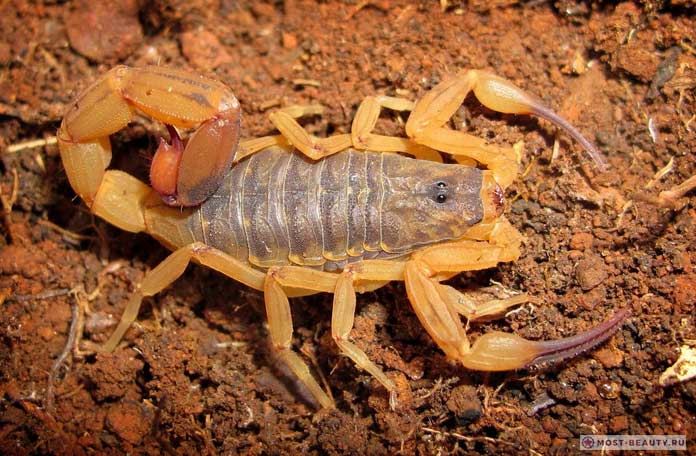 La partie supérieure du thorax contient les yeux. Scorpion — animalLe scorpion, qui peut avoir de une à six paires d'yeux. La position la plus avantageuse est occupée par deux yeux principaux. Ils sont appelés yeux médians et sont situés à l'apex du céphalothorax. Les autres jouent le rôle d'yeux secondaires, situés à gauche et à droite de l'avant du corps.