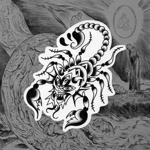 Le Scorpion peut s'inscrire dans un cercle ou un losange. Il se combine bien avec son symbolisme : le signe du zodiaque et l'image de l'emplacement des étoiles, comme sur une carte des étoiles. Très souvent, dans les croquis, le scorpion est associé à d'autres éléments ayant leur propre signification - crâne, serpent, poignard, fleurs.