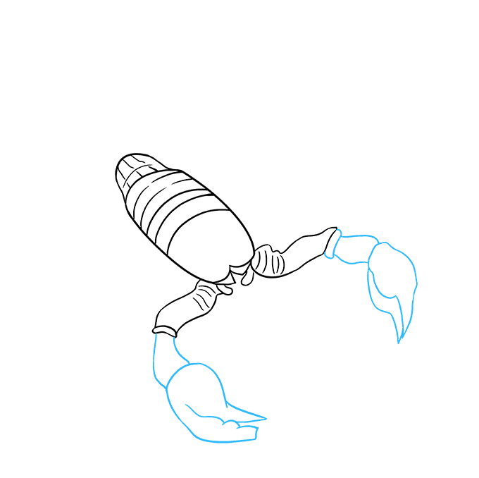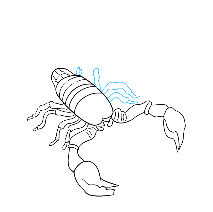 5. Dessine les bras et la bouche du scorpion. Faites des petits triangles en forme de la lettre W. En outre, enfermez les formes allongées et courbes. Dessinez ensuite des séries de lignes courbes vers l'extérieur du visage. Concluez-les à la fin, en utilisant les lignes courbes.