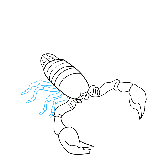 7. Ensuite, dessine les pattes du scorpion. Chaque jambe est constituée de trois sections, chacune plus courte et plus fine que la précédente. Utilisez des paires de lignes courbes pour créer chaque section. Les scorpions ressemblent à des araignées, ils ont donc huit pattes - quatre de chaque côté.