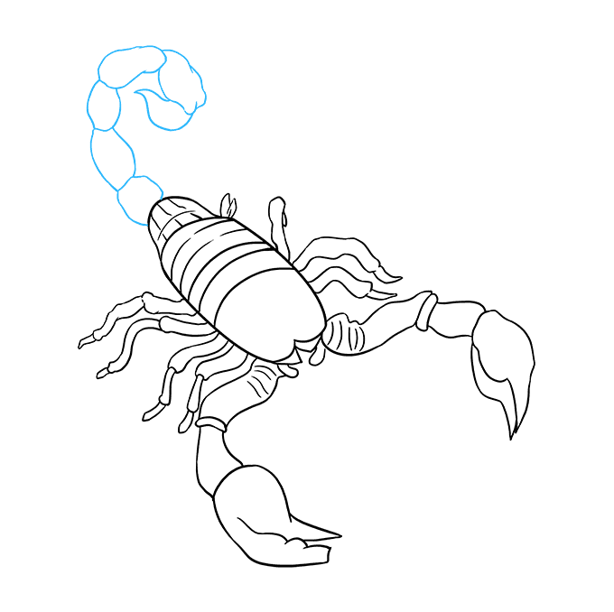 9. Dessinez la queue piquante d'un scorpion. La queue est constituée de plusieurs sections arrondies. Dessinez la queue en ajoutant une forme arrondie irrégulière à la fois. Lorsque vous arrivez à la pointe, ajoutez deux lignes courbes qui se rejoignent en un point aigu pour former un aiguillon.