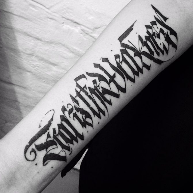 Les tatouages avec inscriptions peuvent être réalisés à différents endroits. Sur le poignet, sur le dos, sur la jambe, sur le bras, sur le cou, sur l'avant-bras, sur la poitrine, sur le côté ou sur les côtes. Mais il est tout aussi important que toutes ces parties du corps soient réalisées dans les règles de l'art. Et nos artisans, que ce soit à partir de zéro, d'une photo ou d'un croquis, sont prêts à réaliser une excellente inscription sur n'importe quelle partie de votre corps.