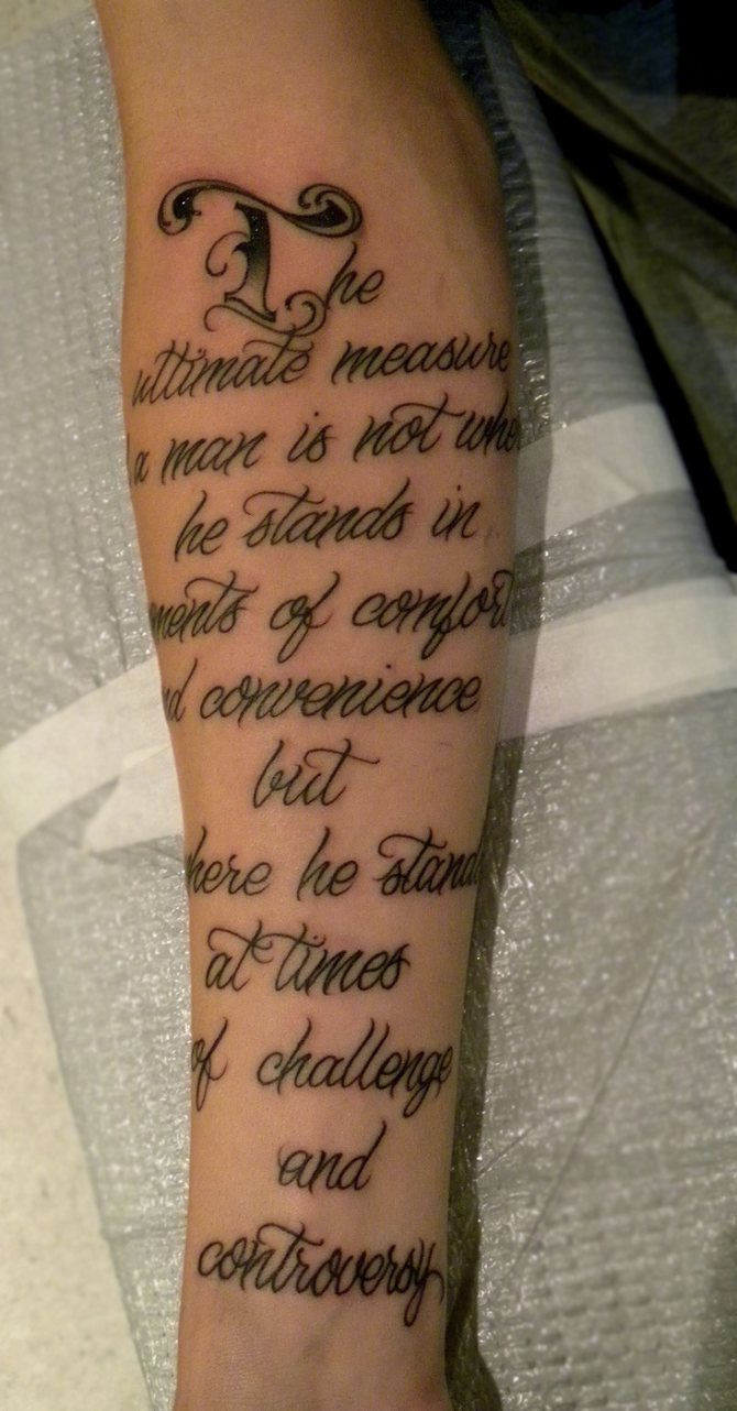 Enfin, vous vous êtes surmonté et avez décidé de vous faire tatouer. C'est une décision qui en vaut la peine, car peu de choses peuvent vous donner autant de personnalité qu'un tatouage distinctif. Mais de plus en plus souvent, les gens préfèrent mettre sur votre corps non pas des images, non pas des photos stylisées, mais de simples inscriptions. C'est peut-être simple, mais c'est élégant et la signification est immédiatement reconnaissable. Et tout le monde peut choisir la phrase à mettre sur le tatouage. Mais il y a un tatouage et une autre caractéristique - il est important de comprendre où vous voulez placer spécifiquement ces inscriptions. Et là, le choix, il faut bien le dire, est étonnamment vaste. Pensez-y, vous pouvez placer une image sur votre poignet, votre bras, votre jambe, votre dos, votre cou, votre avant-bras, votre poitrine, votre côté, vos doigts, vos côtes - sans compter les endroits plus exotiques. Alors quel est le choix le plus judicieux de l'emplacement sur le corps ? Nous allons le découvrir.
