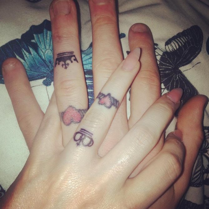 L'option la plus courante est le tatouage d'une alliance par paires. Et dans la plupart des cas, il ne s'agit pas seulement d'un anneau fin autour de l'annulaire, mais d'un motif : queue de cochon, tresse ou ornement.