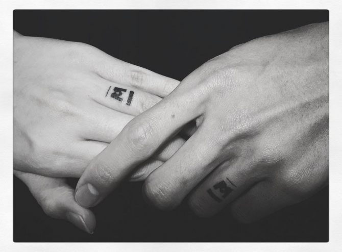 De nombreux couples choisissent de faire "imprimer" sur leur corps les dates importantes de leur relation. Ceux-ci peuvent être en chiffres arabes ou romains. Le plus souvent, un tatouage de date de mariage est placé sur un doigt ou une autre partie de la main, alors vérifiez aussi les options :