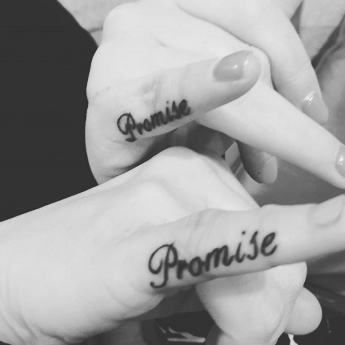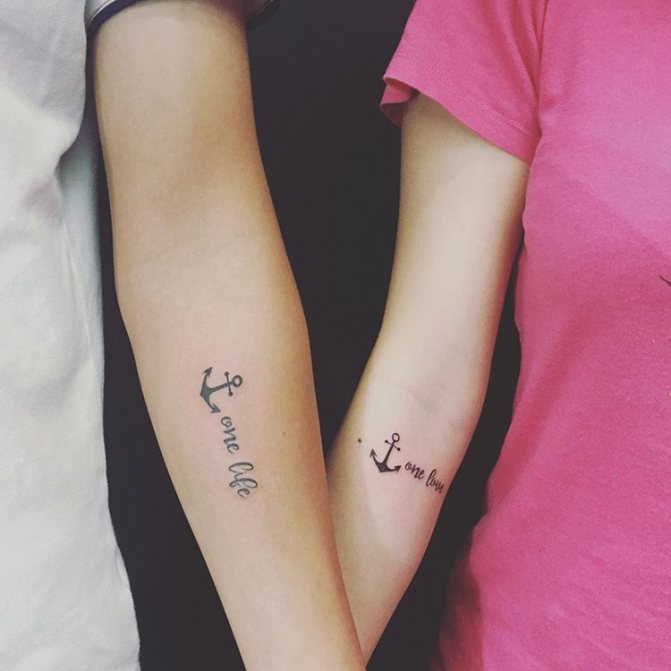 "Always forever", "trust", "love", "love him", "love her", "mine", "mine" - il existe de nombreuses options de mots et de phrases à appliquer comme tatouage. Tout dépend de la signification que vous voulez donner au dessin. Le plus souvent, ces options "sérieuses" sont choisies par les couples qui décident de se faire tatouer pour leur anniversaire de mariage. Derrière les épaules, ils ont déjà l'expérience de la vie de famille. Et ils peuvent dire avec certitude, s'ils sont prêts à vivre ensemble dans la peine et la joie jusqu'à la fin de leurs jours.