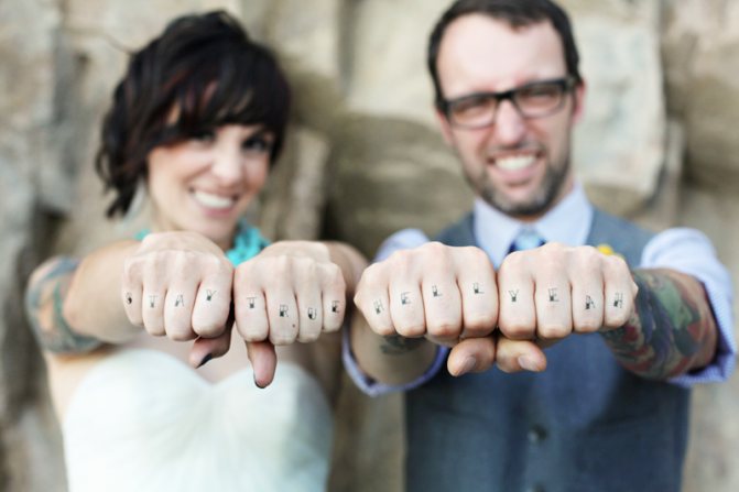 Une mariée avec un tatouage du nom du marié et vice versa - qu'est-ce qui pourrait exprimer vos sentiments de manière plus puissante ? D'ailleurs, ce motif est généralement trop grand pour être placé à l'annulaire. De nombreux couples choisissent donc un autre endroit pour le placer - le poignet, l'avant-bras ou le cou.