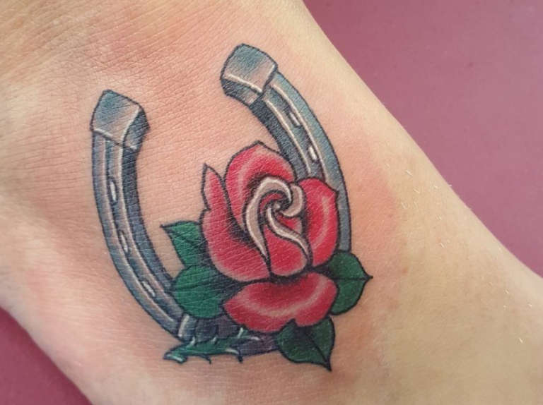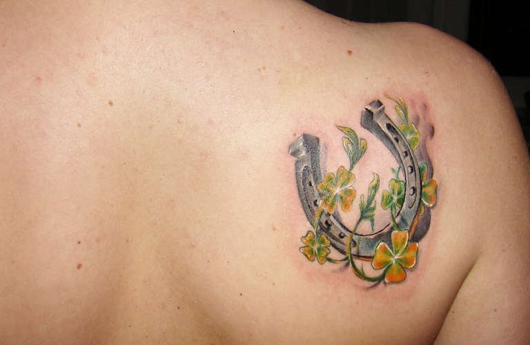 fer à cheval - L'objet est depuis longtemps associé à la chance et à la fortune, il était à l'origine conservé dans les maisons et est aujourd'hui peint sur le corps ;