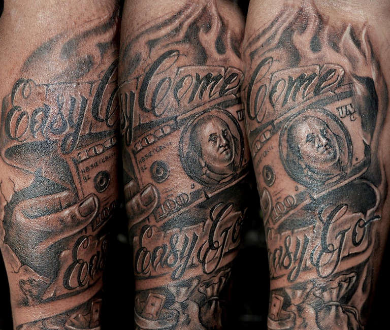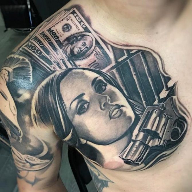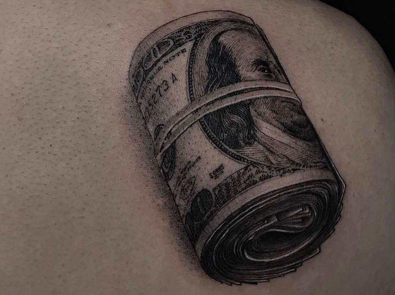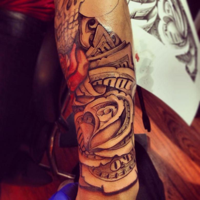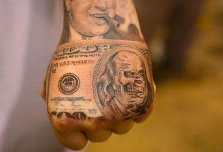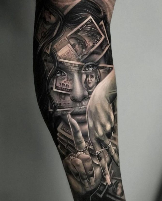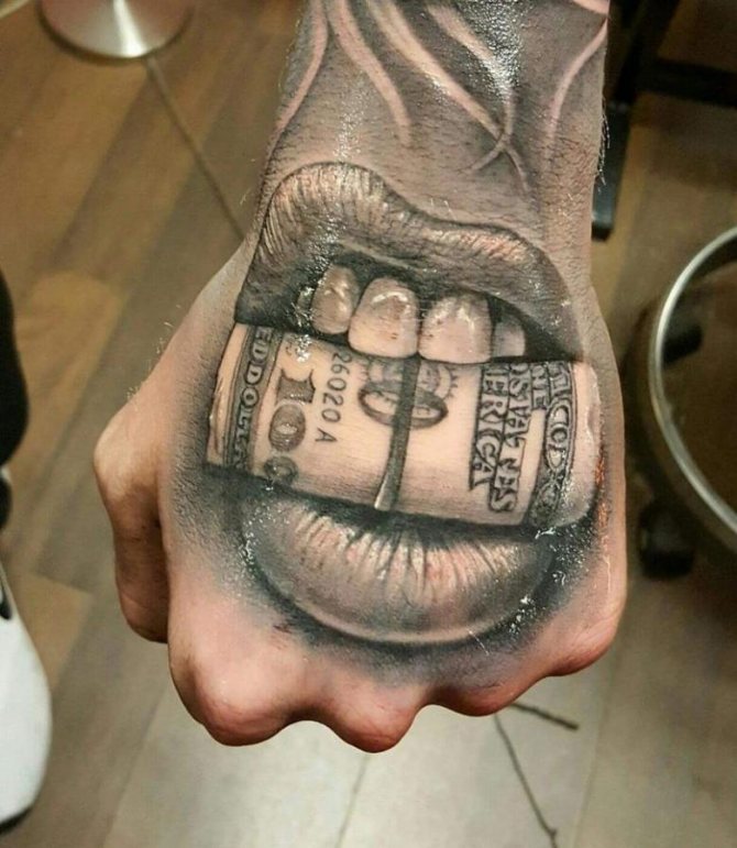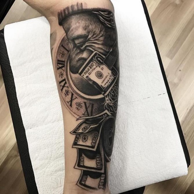 Ce tatouage est imprimé sous la forme de billets de banque ou de pièces de monnaie - de ce sens de l'image n'est pas changé. Vous pouvez soit créer votre propre dessin, soit utiliser une pièce de monnaie rare comme référence. En ce sens, le champ de l'imagination est sans limite.